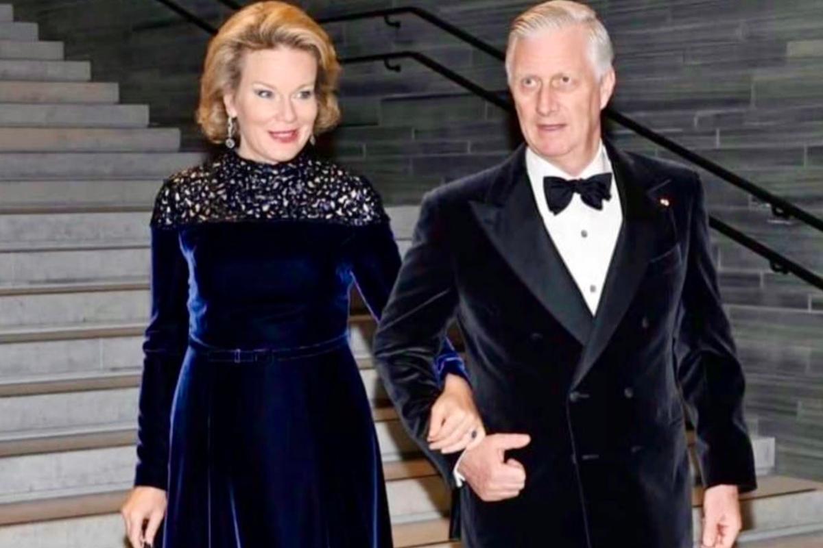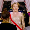 На гала-ужине в Королевском дворце Матильда уже перешла в другой регистр. Town & Country и другие royal-издания отмечают, что для банкета она выбрала полное золотисто-шампанское Armani Privé и тиару Nine Provinces — одну из самых узнаваемых в бельгийском королевском собрании. Это был уже не образ дипломатической сдержанности, а именно монархический вечерний максимум, который полагается случаю такого уровня.