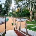 Для путешественника это точка «переключения». Утром — кофе поблизости и круг через арочный вход с плющом: мягкий свет, широкая перспектива аллеи, по пути — лавочки и первые фото. Днём — семейный сценарий: детская площадка с настилами, аккуратные гравийные зоны, безопасные дорожки; собаку можно взять с собой — для неё есть отдельное пространство. Вечером — лучший час: включается тёплая подсветка, тбилисский воздух становится гуще, и даже короткая прогулка превращается в свидание с городом.