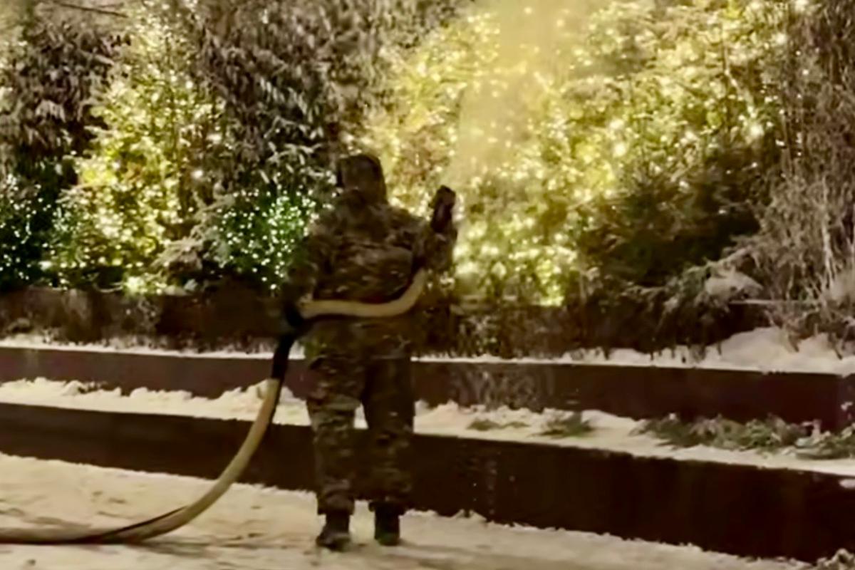 На кадрах — рабочий в зимней форме, шланг, мягкое белое покрытие и аккуратно подсвеченные ели. Это не чрезвычайная ситуация и не эксперимент. В столице просто делают привычное: добавляют городу зиму вручную.