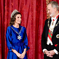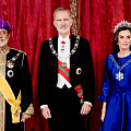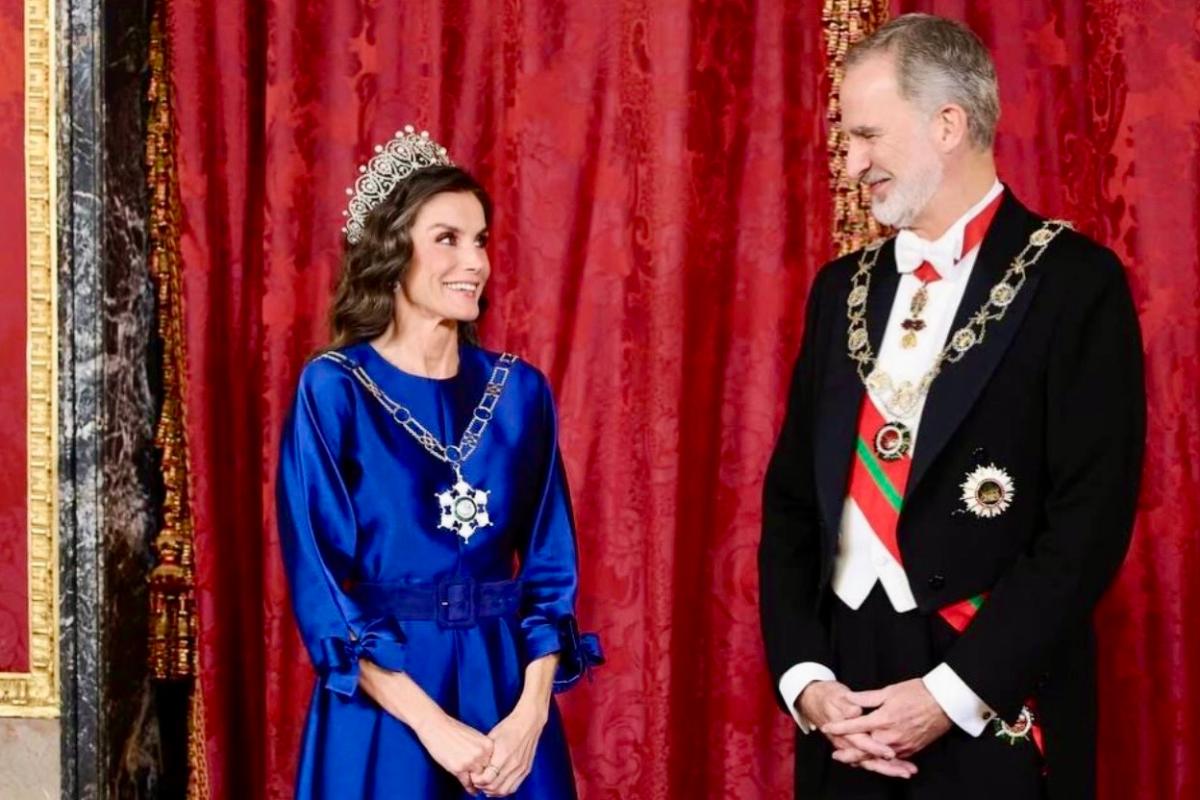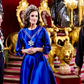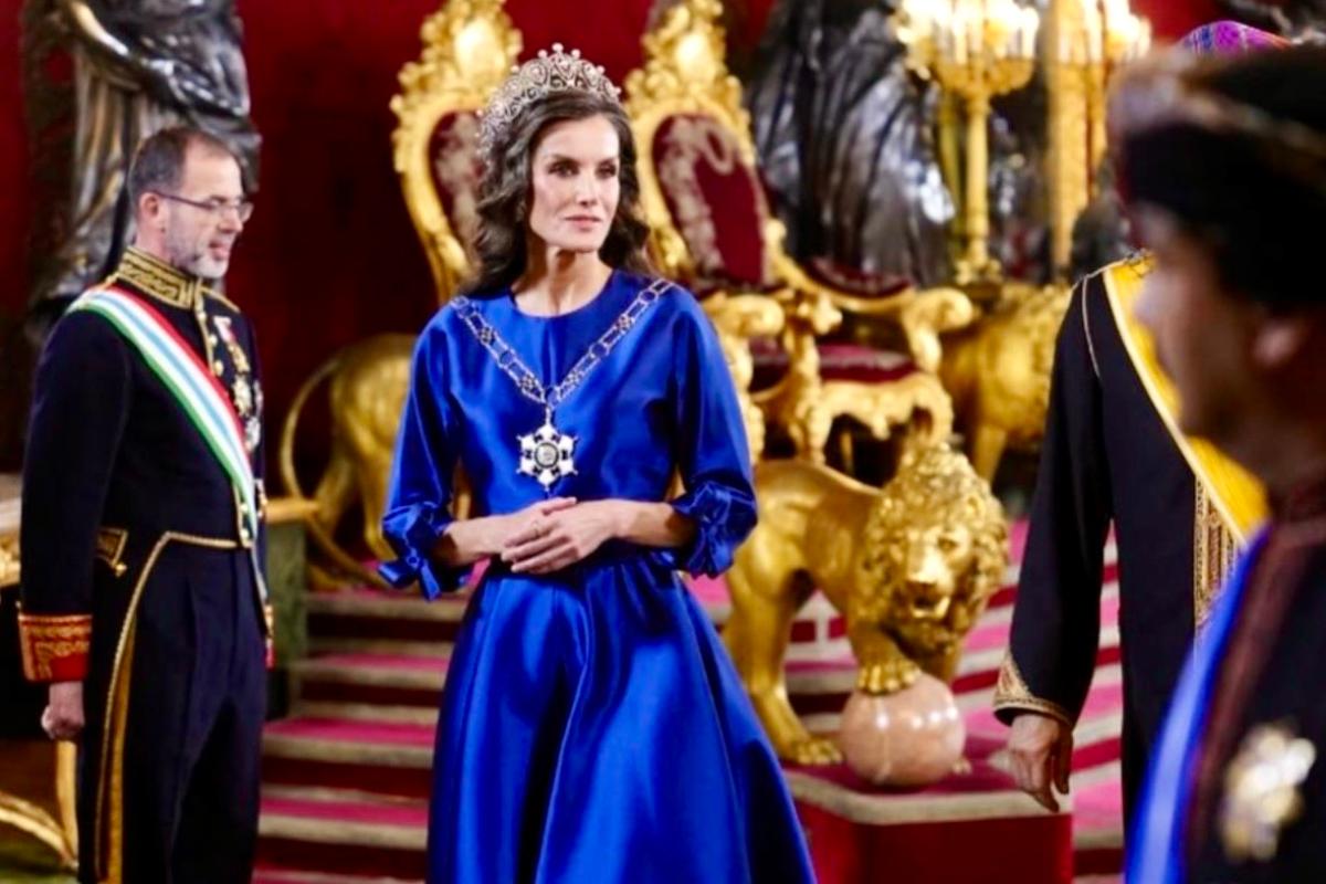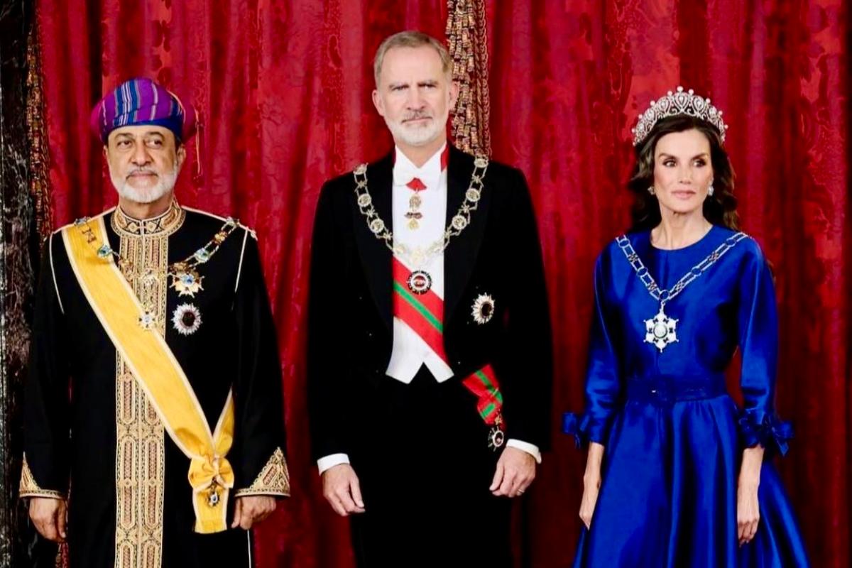 Контекст визита тоже считывается в кадре. Рядом — король Фелипе VI и султан Омана: золотая вышивка национального кафтана рифмуется с испанскими регалиями. Государственные ужины — витрина дипломатии, и выбор полного парада у королевы подчёркивает статус встречи. При этом цвет платья — глубокий королевский синий — традиционно ассоциируется с верностью и стабильностью.