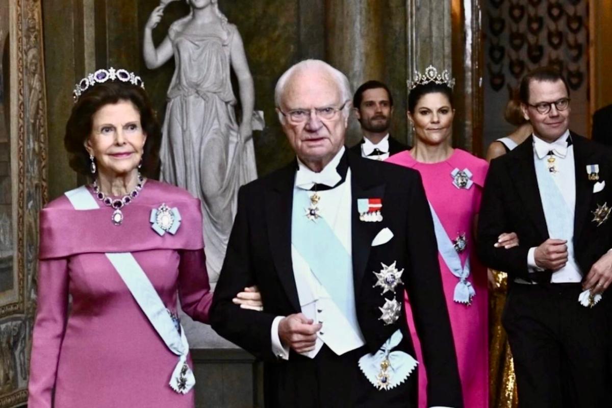 Королевская чета возглавила процесссию, открыв прием в окружении почетных гостей. Королева Сильвия выбрала насыщенное розовое платье с изумительной амарантовой диадемой — один из самых узнаваемых комплектов в ее коллекции. Король Карл XVI Густав вышел в парадном мундире с орденскими лентами и наградами, закрепив торжественный тон вечера.