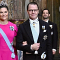 К наследнице престола Виктории в этот раз приковано не меньше внимания: она появилась в ярком малиновом платье, дополненном тиарой и орденской лентой голубого цвета. Принц Даниэль сопровождал супругу в строгом вечернем фраке, как того требуют традиции Нобелевского приема.