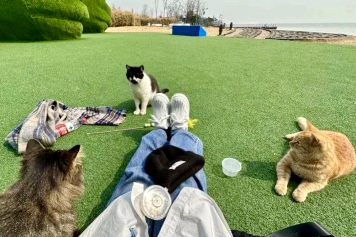 Сначала кажется, что это великая зелёная скульптура. А потом трава шевелится — и на свет выходят кошки.