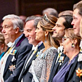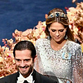 Принц Карл Филипп и принцесса Мадлен тоже поддержали общий настрой вечера. На снимках с церемонии Мадлен появилась в воздушном серебристо-сером платье с расшитым кристаллами верхом и лёгкой многослойной юбкой. Тону наряда соответствовала тиара с голубыми камнями и серьги в том же ключе — классический пример того, как можно вписать семейные драгоценности в актуальный вечерний образ.