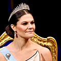 Рядом с матерью — кронпринцесса Виктория в более графичном образе. Её белое платье с асимметричным верхом и чёрной окантовкой выглядит почти архитектурным: чёткие линии, собранный силуэт, акцент на плечах и поясе. Ледяной оттенок ткани поддерживает светло-голубая лента ордена и бриллиантовая тиара с тонкими лучами, которая создаёт ощущение сияющего венца. В паре с лаконичными серьгами и браслетом образ читался современно, но без нарушения строгого дворцового протокола.