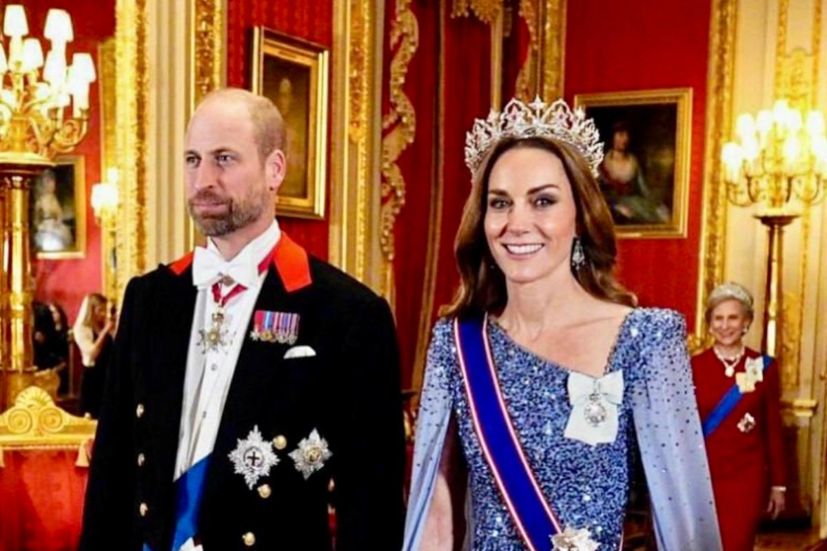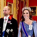 Выбор платья под такую тиару тоже не оставили случаю. Принцесса Кэтрин вышла в насыщенно-синем пайеточном платье-кейпе от Jenny Packham — любимого бренда её вечерних выходов. Мягкий шлейф, сложная вышивка и легкая полупрозрачная накидка создавали эффект движения даже на статичных кадрах. Королевские ордена, лента и звезда завершали образ, подчеркивая официальный статус момента: не просто банкет, а встреча союзников.