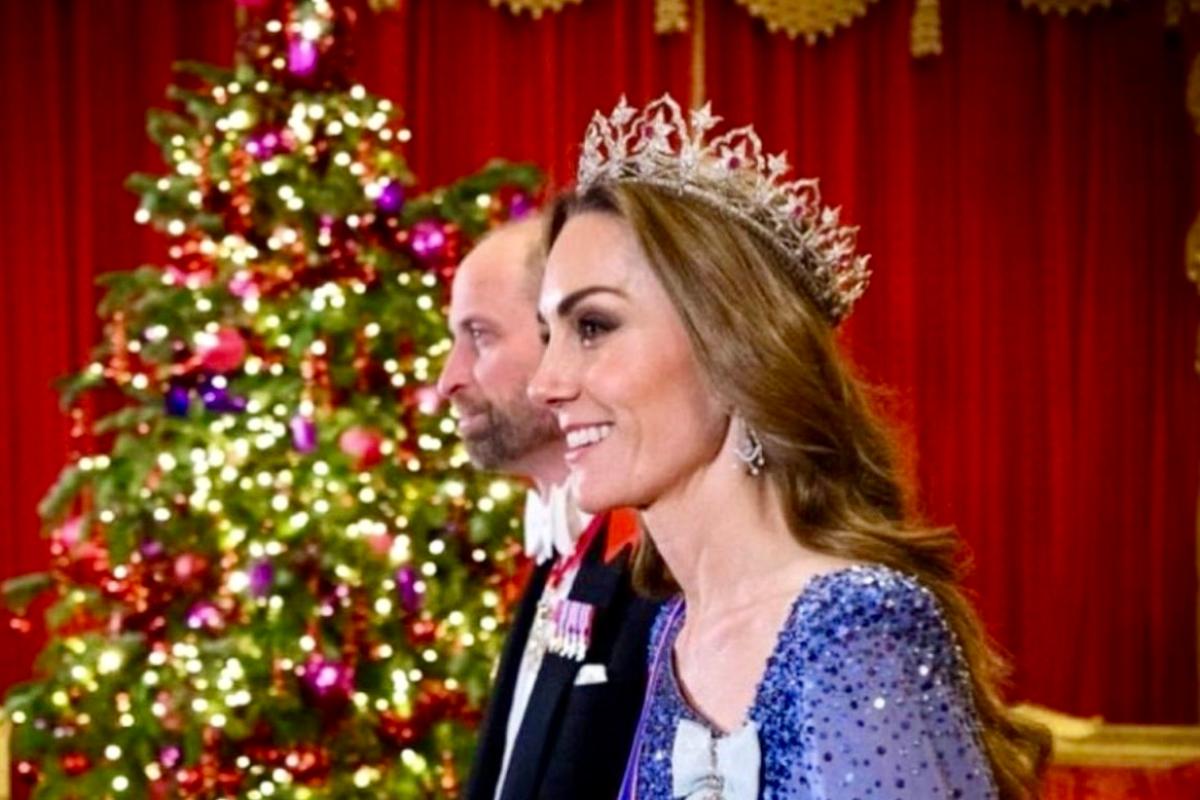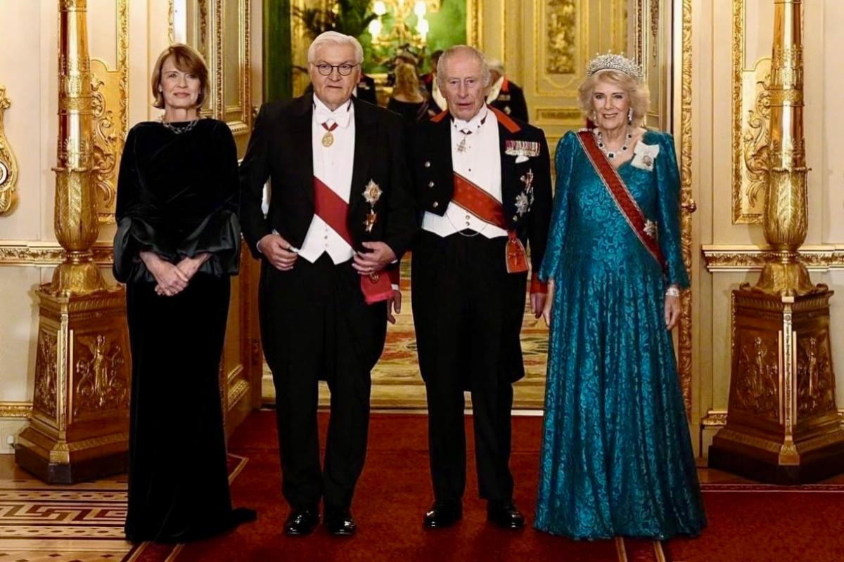 На официальных портретах и кадрах из Виндзорского замка видно: это уже не просто приём, а почти новогодняя открытка монархии. На лестнице — принц Уильям и принцесса Кэтрин, на заднем плане — ёлка, в зале — красный ковёр, золото и рождественские огни. Государственный банкет в честь президента Германии Франка-Вальтера Штайнмайера и его супруги Эльке Бюденбендер стал главным королевским светским событием декабря.