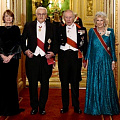 В зале тем временем шёл свой дипломатический вальс. В первой шеренге гостей — король Карл III и королева Камилла, президент Германии с супругой, члены королевской семьи. Камилла выбрала платье цвета морской волны и одну из своих «дежурных» тиар — «Тиару от девушек Великобритании и Ирландии», делая ставку на проверенную классику. На общем кадре две королевские пары выглядят как зеркальные версии: одна — в холодной голубой гамме, другая — в тёплом зелёно-красном тоне.
