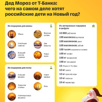 Деньги и другие «взрослые» подарки упоминались крайне редко — всего в 1,5% случаев. При этом именно необычные просьбы привлекли наибольшее внимание. Среди них — 100 килограммов пельменей, 10 килограммов золота, 100 тысяч эскимо, 10 тысяч роблоксов и даже красная икра. Отдельной категорией стали желания, адресованные родителям: мамам дети заказывали iPhone, сумки, дома и кухни, папам — закрытие ипотеки, автомобили и яхты.