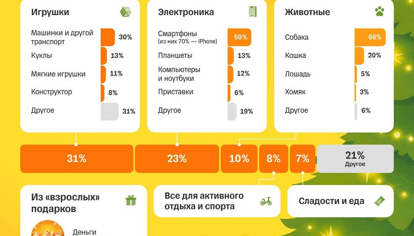 Как следует из данных издания «Известия», сервис работал с 18 декабря 2025 года по 15 января 2026-го и принимал звонки со всей страны. Чаще всего дети просили у виртуального Деда Мороза игры и игрушки — 31% обращений. На втором месте оказалась электроника (23%), затем животные (10%), спортивный инвентарь (8%) и сладкие подарки (7%).
