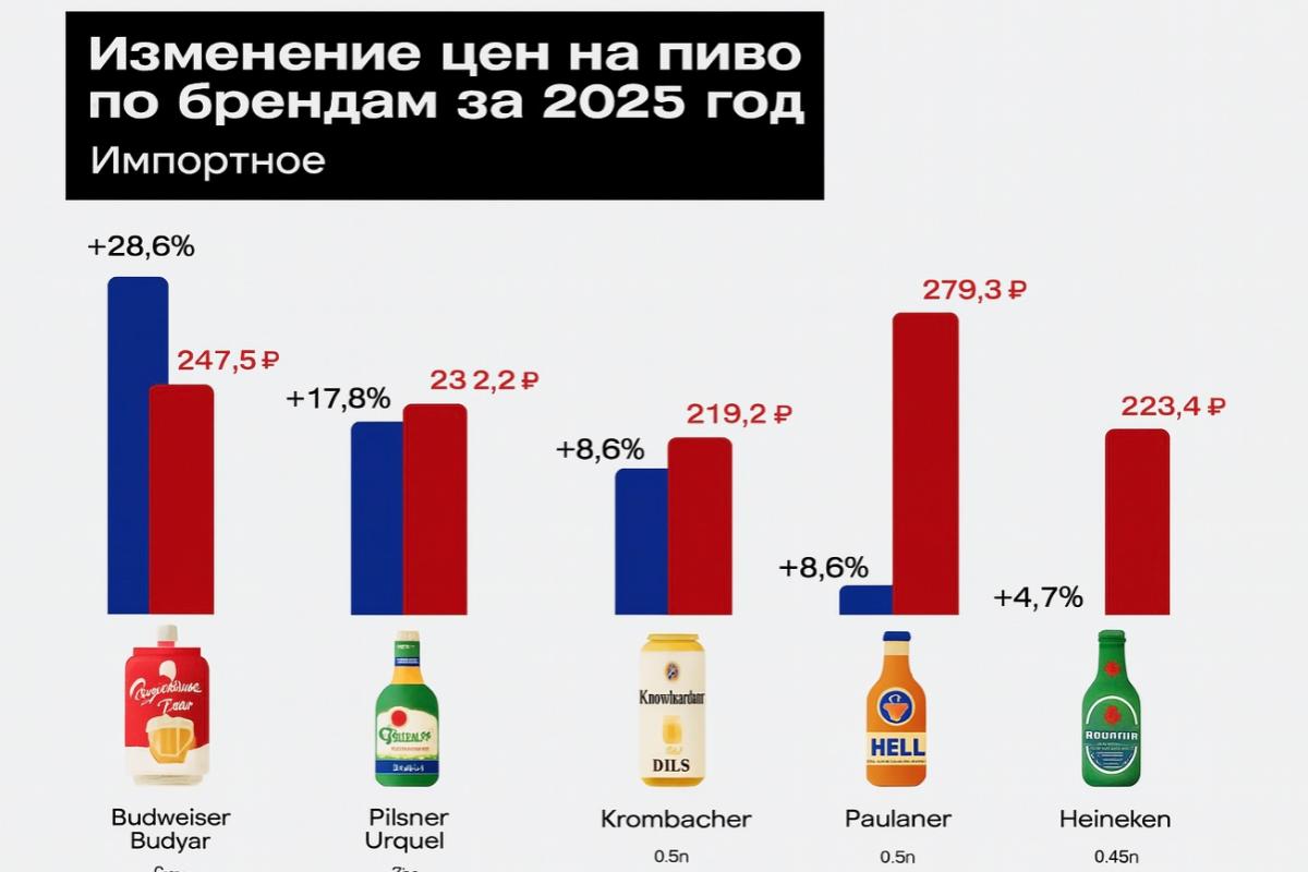 По данным отраслевой статистики, рынок пива за последний год пережил заметный рост цен. Импортные марки, на которые ранее были повышены пошлины, прибавили в цене около 18,6%. Это напрямую связано как с увеличением стоимости ввоза, так и с удорожанием логистики и сокращением части импортных линеек, которые перестали быть экономически выгодными.