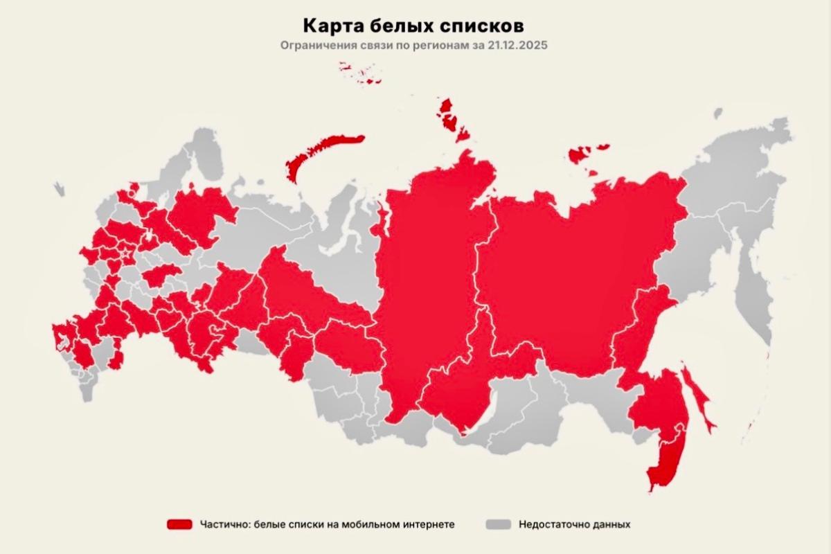 К концу недели 21 декабря более двух третей регионов столкнулись с отключениями мобильного интернета и режимом «белых списков» — связь в стране вошла в режим управляемой нестабильности.