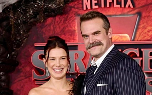 Милли Бобби Браун и Дэвид Харбор на премьере «Очень странных дел».