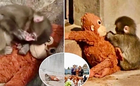 В японском зоопарке маленький макак таскает за собой плюшевого орангутана — и ...